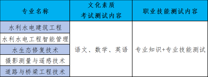 第十四条 此次高职单独招生考试采取“文化素质+职业技能测试”的模式,考试时间为3月31日(其中文化素质测试时间为3月31日上午9:00—10:30,专业知识测试时间为3月31日上午10:30—11:30,专业技能测试时间为3月31日下午13:00开始)。各专业考试方式具体见下表。