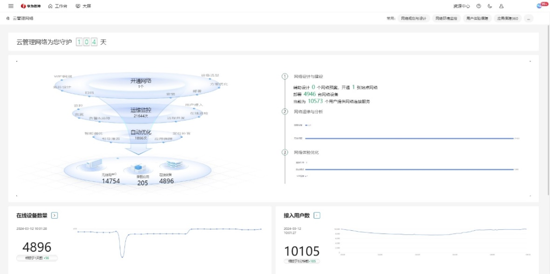 为降低运维压力,华为乾坤云管理网络支持全网用户体验评估分析,通过智能无线射频调优技术,实现网络自动调优。同时,能够回放整个用户接入旅程,并协议级回溯定位接入问题,实现分钟级故障定位,提升效率达80%。云端平台对网络设备进行集中管理运维,将设备单次运维时间从7天缩短至0.5天。如提升礼堂、图书馆等高密场景接入稳定性与网速,解决宿舍楼弱信号覆盖、高频干扰、空口阻塞等问题。与此同时,平台还可实时推送设备告警、设备升级等信息,提供一站式集中运维管理,全面提升运维效率。