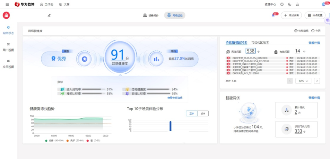 华为乾坤云支持网络健康度管理
