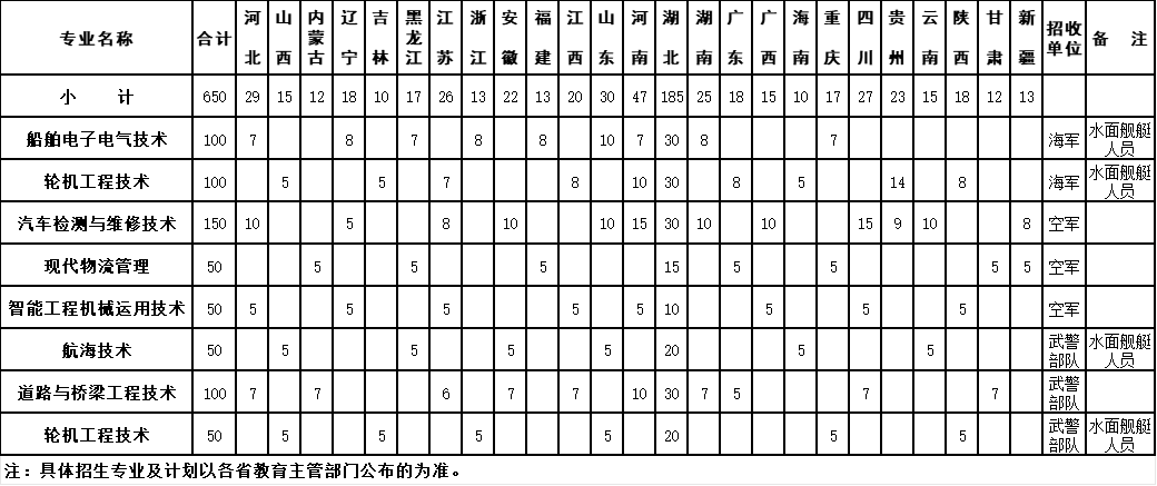 学校面向河北、山西、内蒙古、辽宁、吉林、黑龙江、江苏、浙江、安徽、福建、江西、山东、河南、湖北、湖南、广东、广西、海南、重庆、四川、贵州、云南、陕西、甘肃、新疆25个省(市),海军、空军、武警部队三个军兵种7个专业开展定向培养军士生招生。