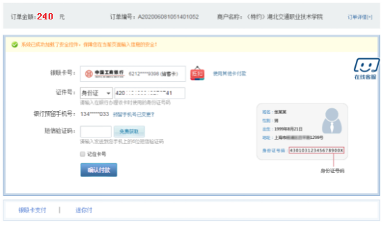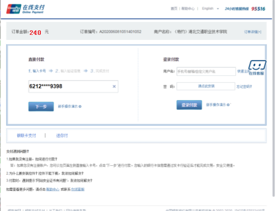 点击:去缴费,出现支付界面,在直接付款选项“输入卡号—输入验证信息—完成支付”完成缴费。