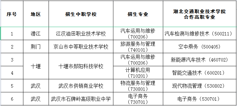 根据省教育厅关于公布2021年五年制高等职业教育招生学校和专业目录的通知(鄂教职成函〔2021〕6号),湖北交通职业技术学院和湖北省部分优质中等专业学校2021年联合开展“3+2”中高职分段培养改革试点工作。“3+2”中高职分段培养为在中职学校就读3年后,再转入我校就读2年,毕业后颁发专科毕业证书的教学培养方式。