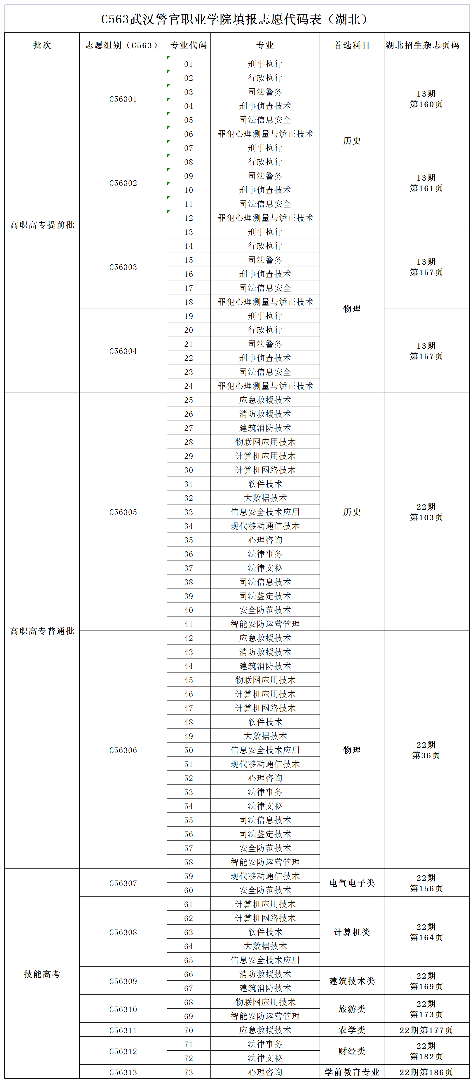 武汉警官职业学院填报志愿代码表(湖北省内)