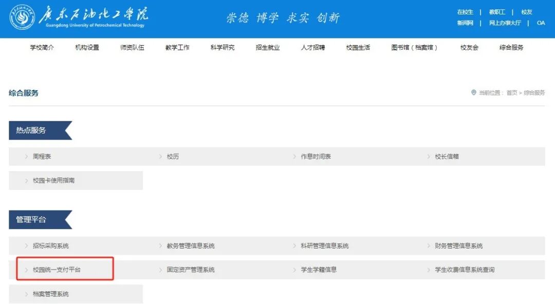 第一步:登录广东石油化工学院官网(https://www.gdupt.edu.cn/),点击右上角“综合服务”。