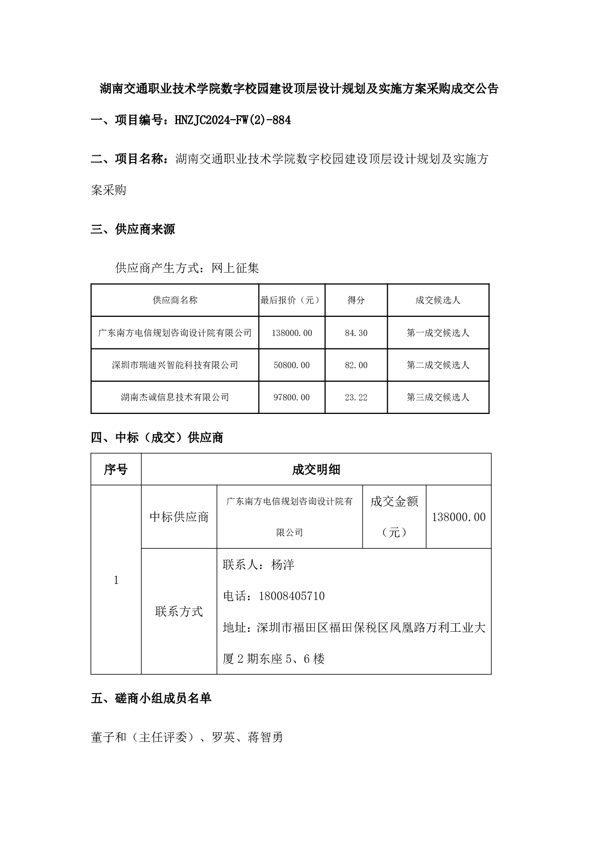 湖南交通职业技术学院数字校园建设顶层设计规划及实施方案采购成交公告