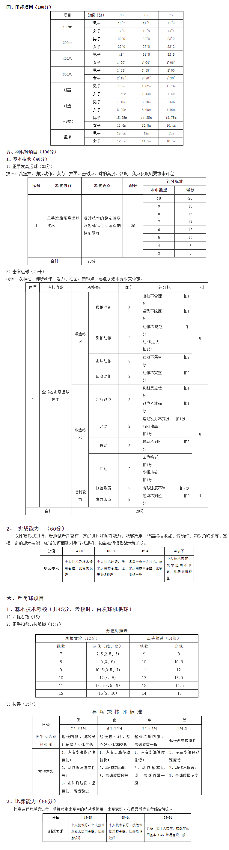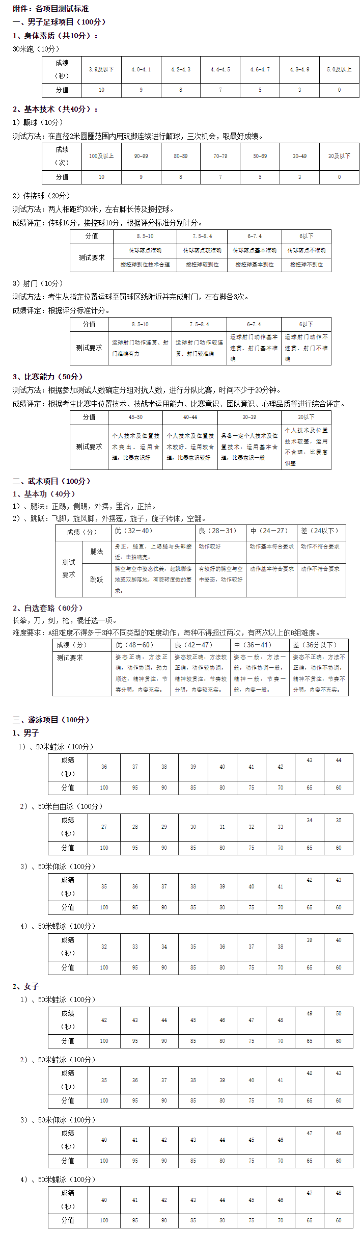 5、测试内容及标准。足球(男子)武术、游泳、田径、羽毛球、乒乓球项目分别组织专项测试,内容及标准见附件。