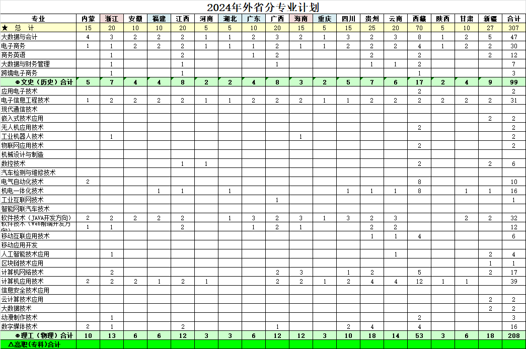 2024年我院在外省分专业招生计划