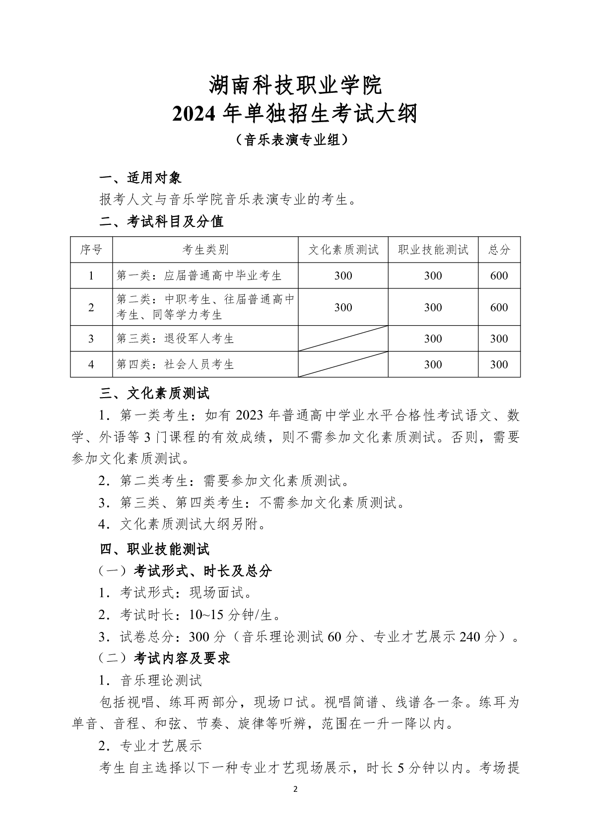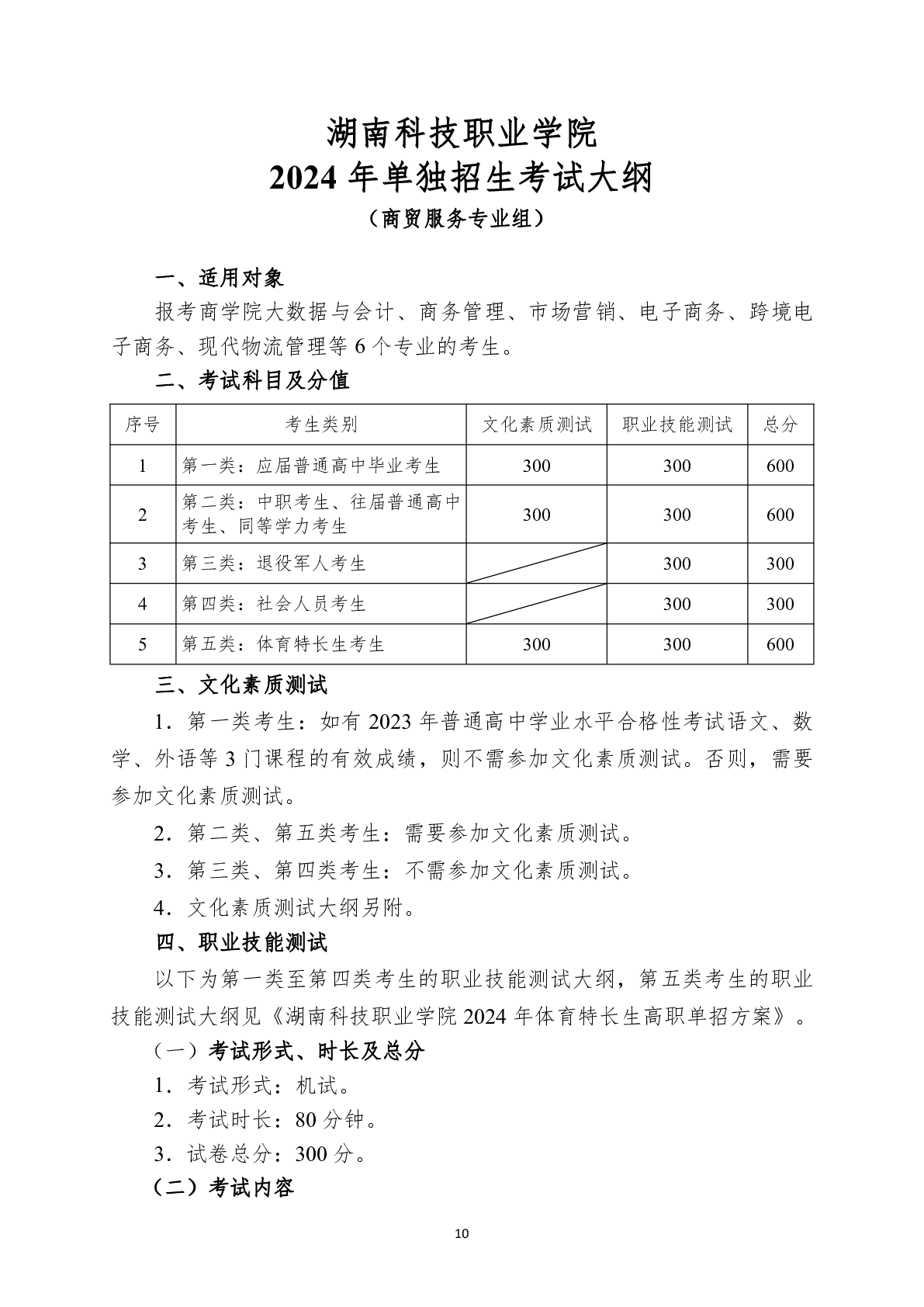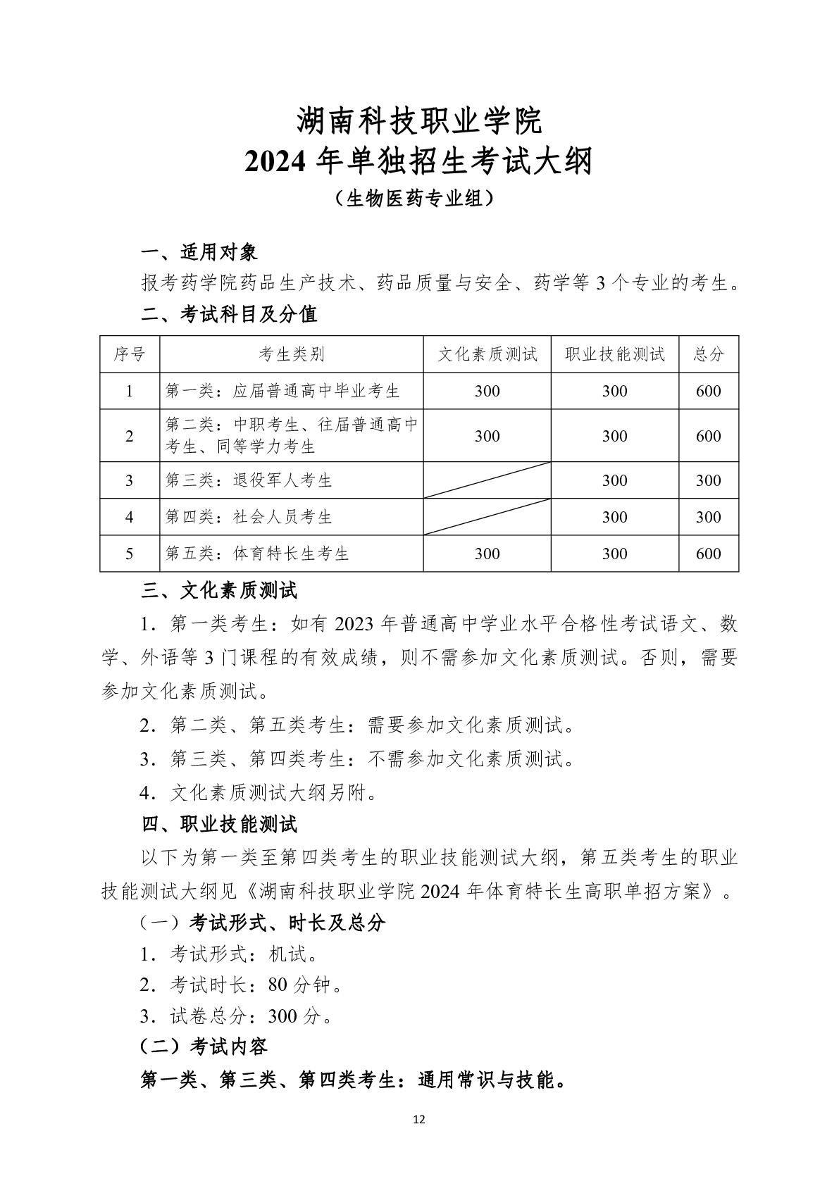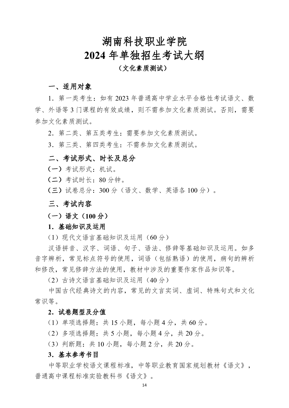 湖南科技职业学院2024年单独招生考试大纲