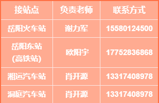 学校共设立了岳阳火车站出站口、岳阳东站(高铁站)出站口、岳阳洞庭汽车站出站口、岳阳湘运汽车站出站口四个迎新服务点。各站点提供免费的大巴车,可以直达校园里面,每个站点都有身穿统一工作服、佩戴工作牌的志愿者,需要帮助可以找他们哟!一切就绪只等你来!