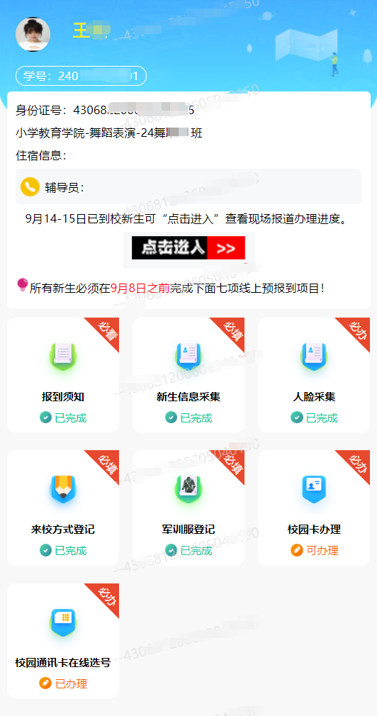 展示新生的学院专业、班级、宿舍和辅导员信息。9月14-15日已到校新生可“点击进入”查看现场报到办理进度。