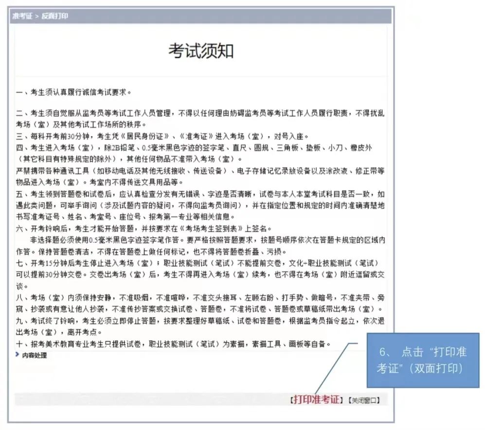 6、 点击考生须知右下角的“打印准考证”,要求双面打印。(注:将垂直滚动条往下拖动可看到考试须知。)