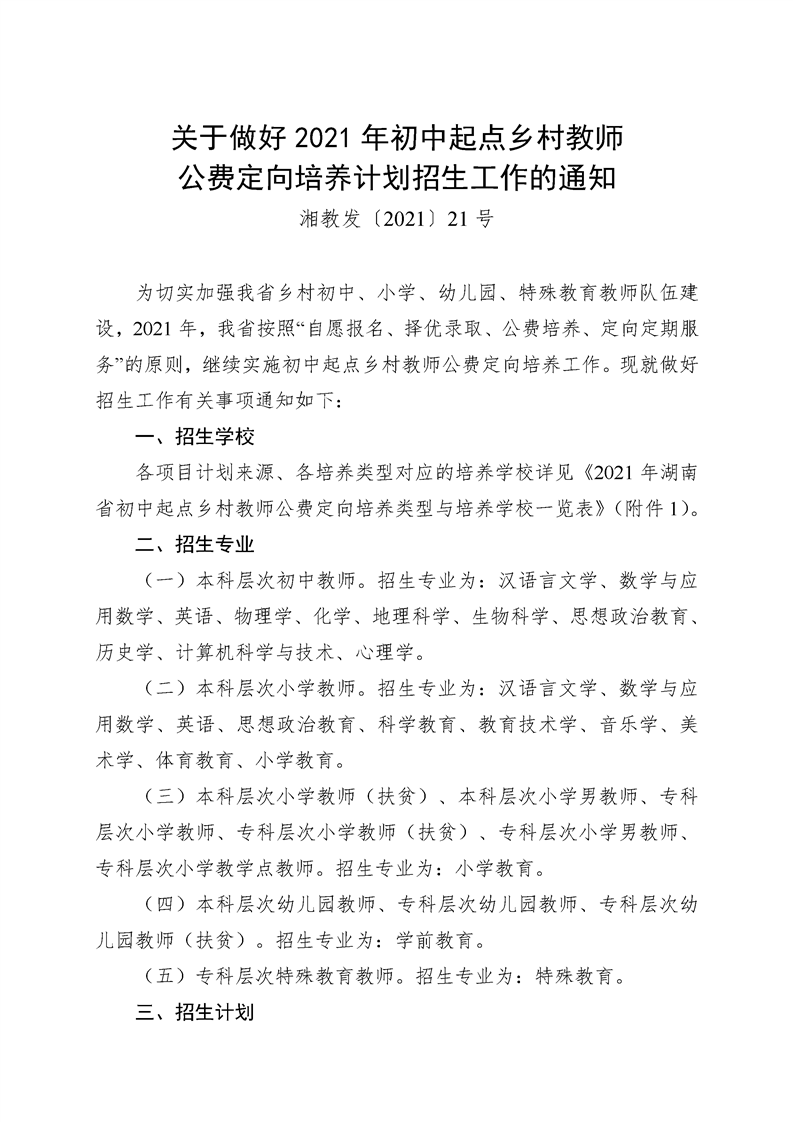关于做好2021年初中起点乡村教师公费定向培养计划招生工作的通知