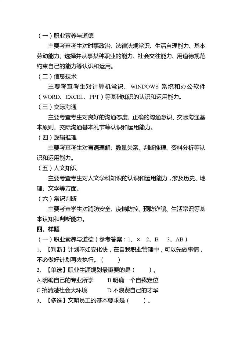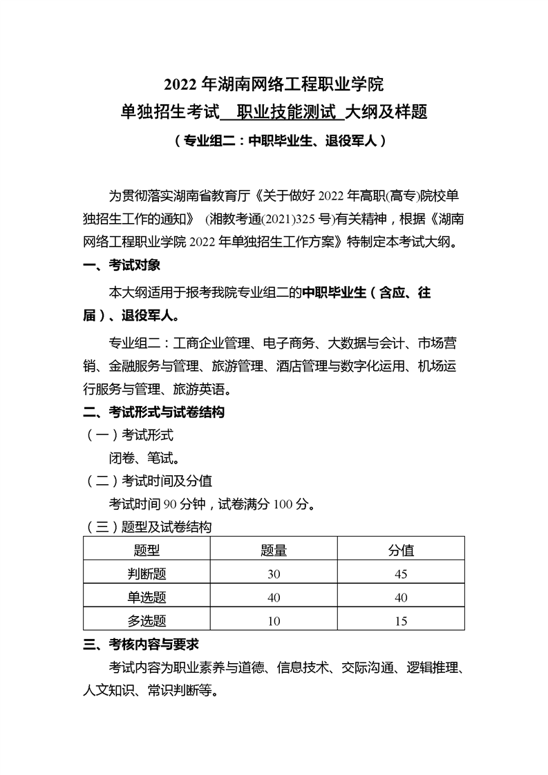 2022年单招考试职业技能测试部分考纲及样题(应往届中职考生、退伍军人——专业组二)