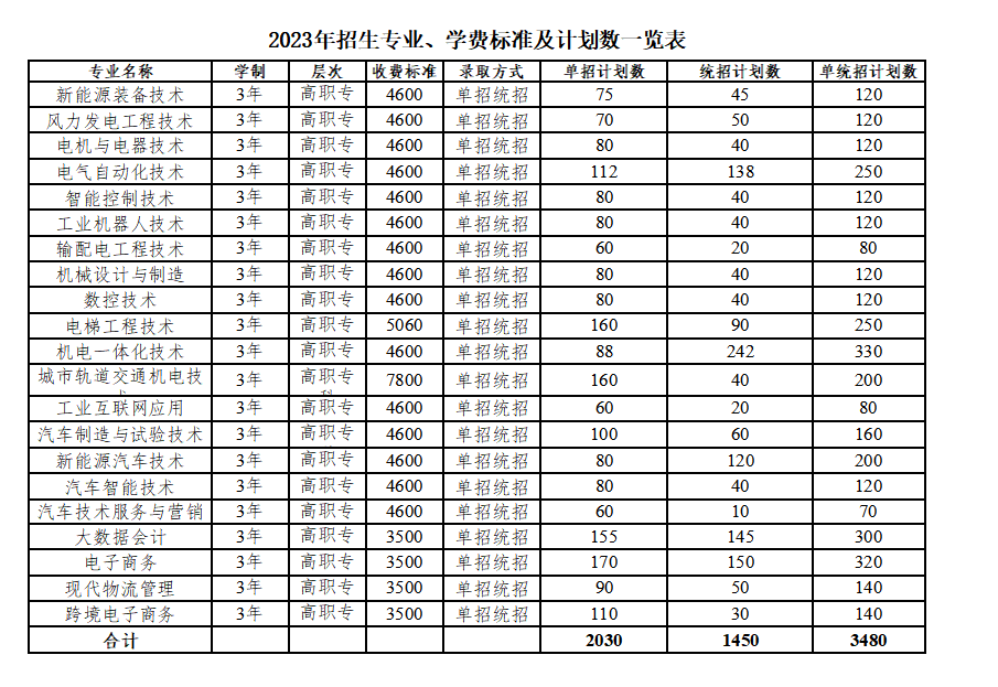 2023年招生专业、学费标准及计划数一览表