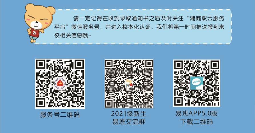1.关注学院易班微信号。微信扫描下方二维码关注“湘商职云服务平台”服务号,并按《2021级新生入驻易班邀请函》(见附件1)做好认证工作,并在校本化应用中填报个人相关信息。我们也将通过系统第一时间下发有关来校报到的疫情防控相关要求,也请你在系统中配合学院各项来校报到前的有关工作。