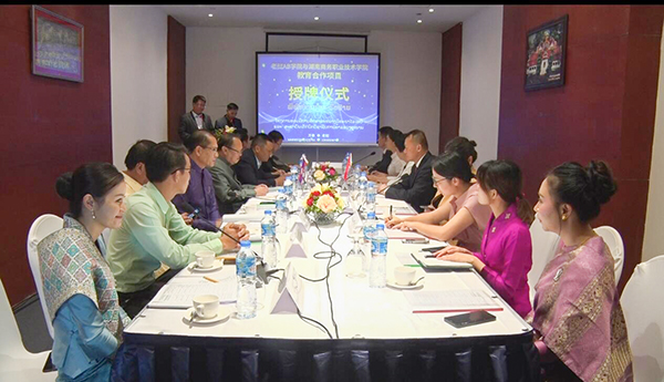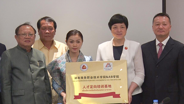 6月1日上午9时,在老挝教育与体育部外联司副司长蒲翁•汪苏提(Pouvanh Vongsouti)、万象市教育与体育厅厅长松浦•高本亚(Somephou Keopanya)、曾震亚等领导的见证下,李定珍与老挝AB学院院长福提一同参加了人才定向培养基地授牌仪式。双方均表示,授牌湖南商务职业技术学院与AB学院人才定向培训基地,是双方合作历程中里程碑式的进展,是积极响应两党两国签订并实施的《构建中老命运共同体行动计划》的具体举措,对加强中老语言与文化教学合作、促进文化交流有深刻意义,希望双方通过合作培养电子商务、市场营销、会计、旅游管理等更多专业人才,为中老教育事业发展做出更大贡献。