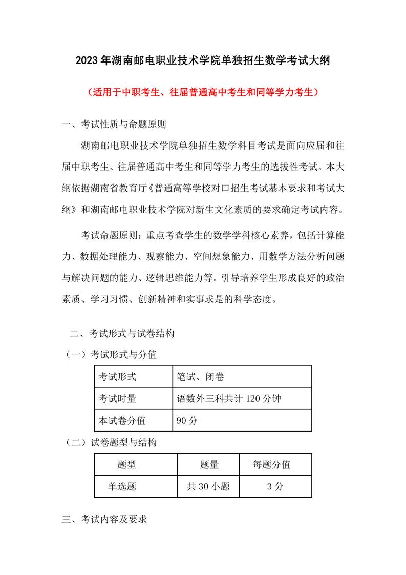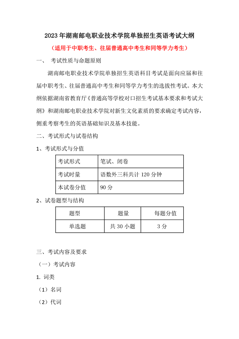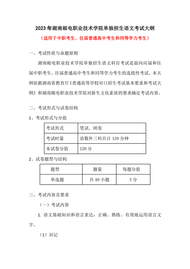 2023年湖南邮电职业技术学院单招文化素质测试语数英考试大纲及样题(中职生、往届高中生、同等学力考生)