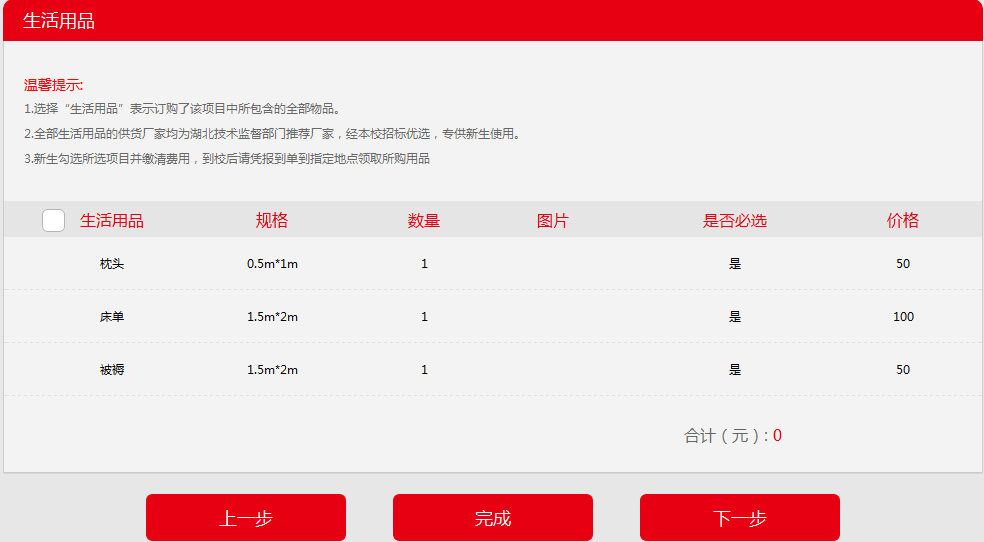 点击“生活用品”,进入生活用品选择页面,新生可以按需要选择所需物品,并提交。