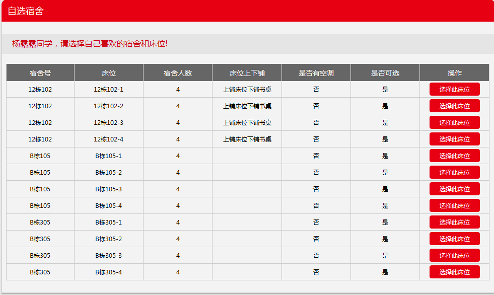 点击住宿信息,学生可以通过学校提供宿舍进行选择(必须明确班级和宿舍对应关系),新生可以在该页面进行选择。
