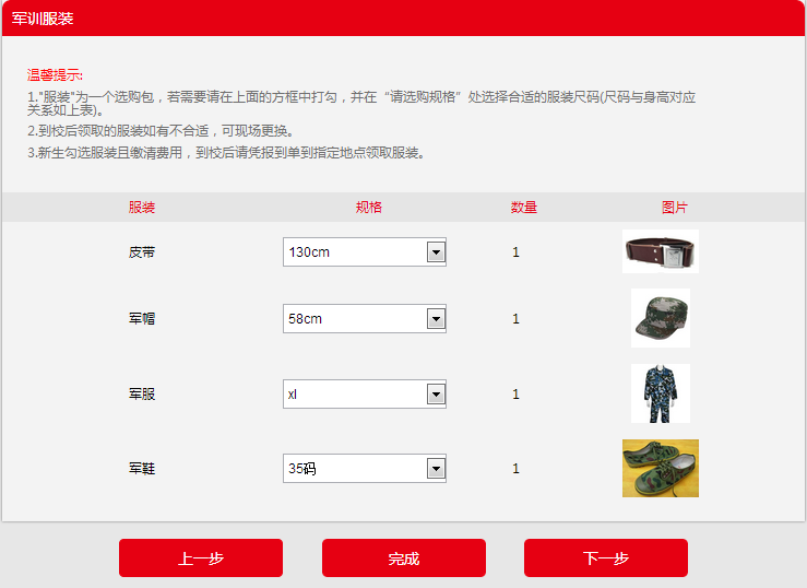 点击“下一步”进入军训服装选择页面,新生可以在该页面进行军训服装选择,选择相应的服装尺码等,点击“完成”进行提交。