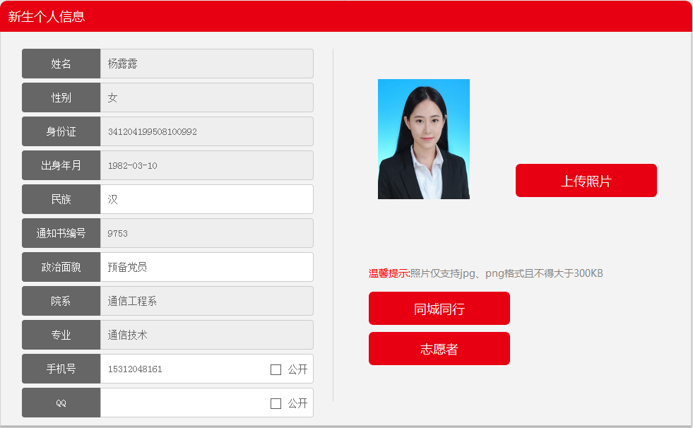 在新生个人信息页面,新生可查看个人信息,修改部分信息。点击“上传照片”,可按学校要求上传个人一寸照片、生活照等。点击“同城同行”可查看同城老乡,点击“志愿者”可以查看志愿者信息.