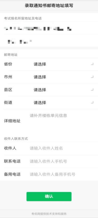 1、请据实填写录取通知书邮寄地址,要求选择省市县街道,并在详细地址栏内填写具体投寄信息;(详细地址栏内请勿重复填写省市区县街道等信息)