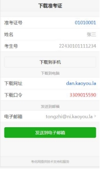 点击“打印准考证”按钮可以下载准考证,下载提供三种方式:下载到手机、下载到电脑、发送到电子信箱。