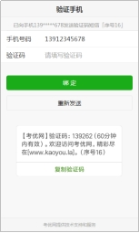 为便于联系考生,打印前需验证考生联系电话的有效性。系统向考生手机发送随机验证码短信,考生收到验证码短信后,填写收到的验证码完成验证。
