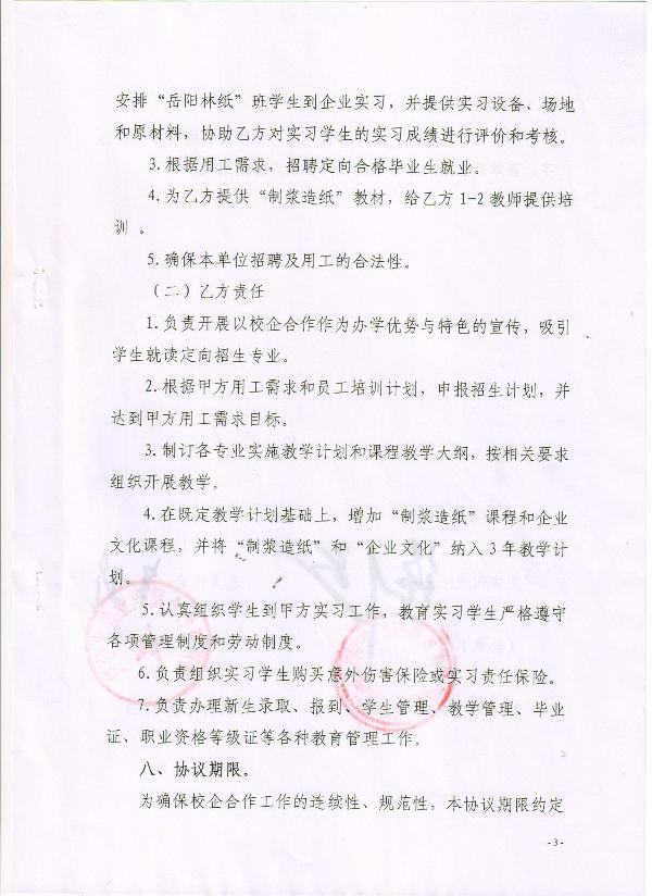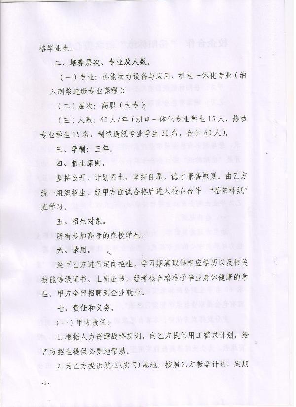 “定单班”学生,学习期满取得相应学历以及相关技能等级证书、上岗证书,经考核合格准予毕业身体健康的学生,岳阳林纸股份有限公司全部招聘到企业就业。并签订正式工劳动合同。确保用工的合法性。