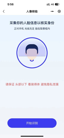 由于采集人脸信息容易,受到表情、妆容、环境光等多种不特定因素影响,请保证核验时光线充足,妆容得当,正脸对准屏幕且完整清晰。