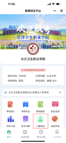 方法②:微信搜索并进入”长沙卫生职业学院“小程序,找到”人像核验“版块,点击进入即可
