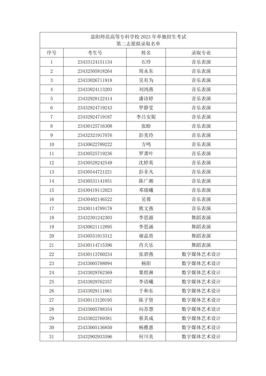 益阳师范高等专科学校2023年单独招生考试第二志愿拟录取名单公示
