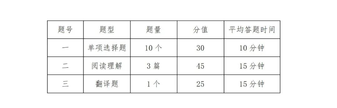②考核内容:考核考生的英语词汇、语法基础和英文翻译(英译中)能力。