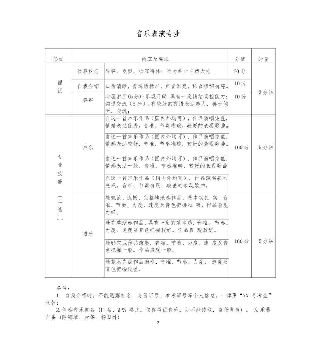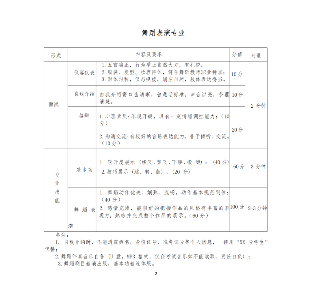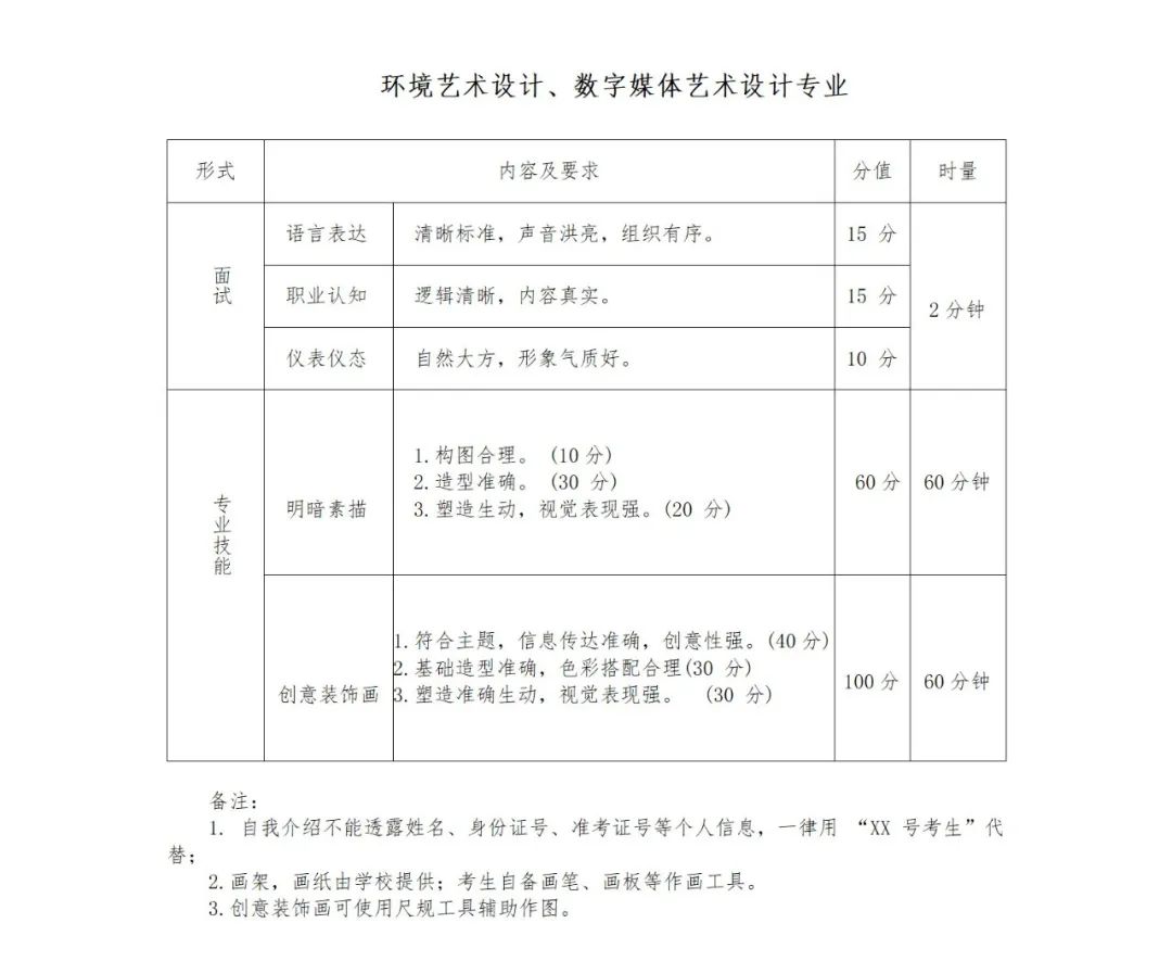 2.报考专业组二的考生职业技能测试为“专业技能测试+面试”,总分 200 分,主要测试专业基本技能、相应的艺术素养等,专业技能测试所占分值的比重为职业技能测试总成绩的 80%,面试所占分值的比重为职业技能测试总成绩的 20%。
