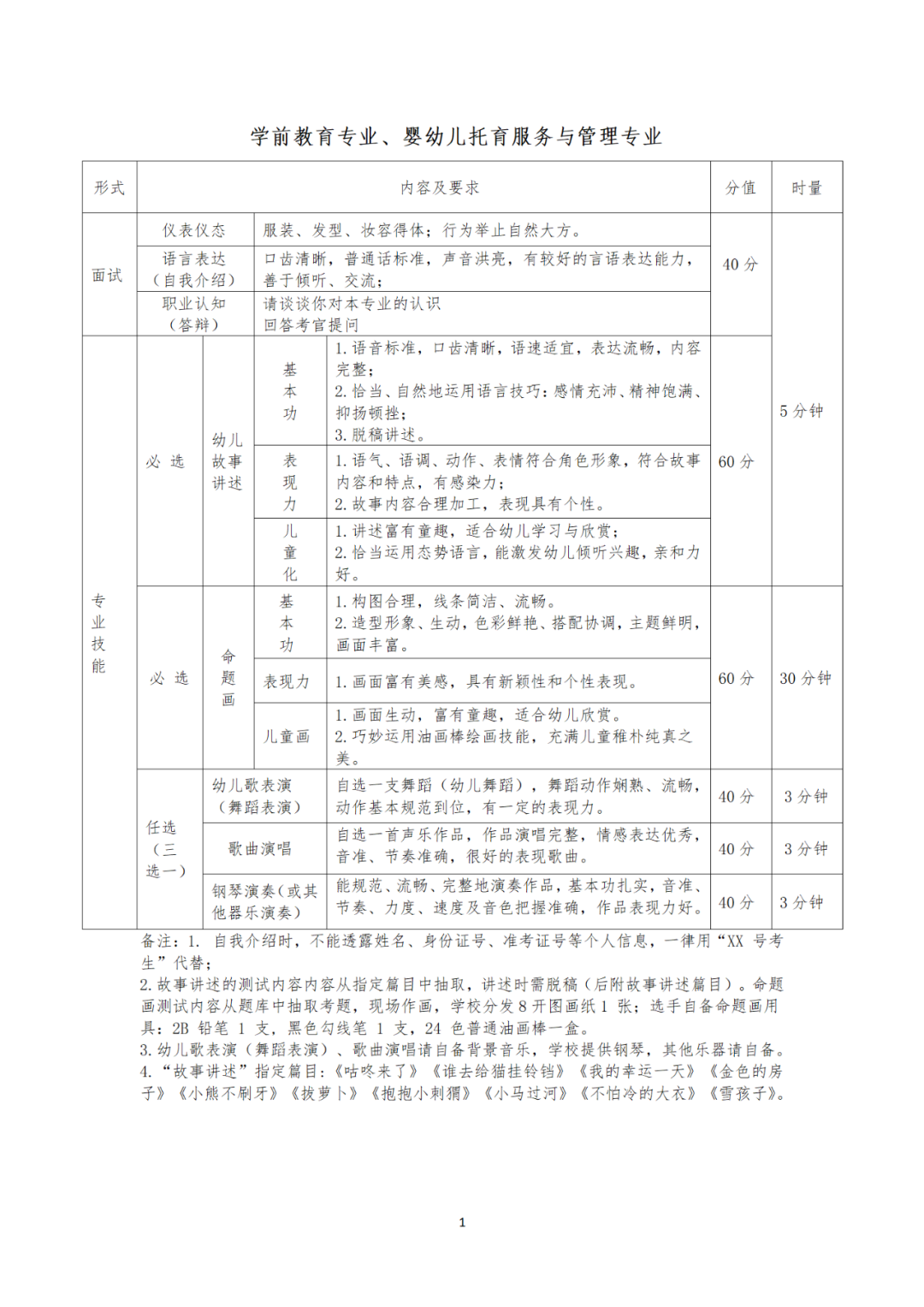 1.报考专业组一的考生职业技能测试形式为“专业技能测试+面试”,总分 200 分。专业技能测试主要采取笔试、机试或实践操作等客观方式考察考生职业技能,所占分值的比重为职业技能测试总成绩的 80%;面试主要测试考生语言表达能力、普通话能力、书写能力、才艺特长和动作协调等综合素质,所占分值的比重为职业技能测试总成绩的20%。