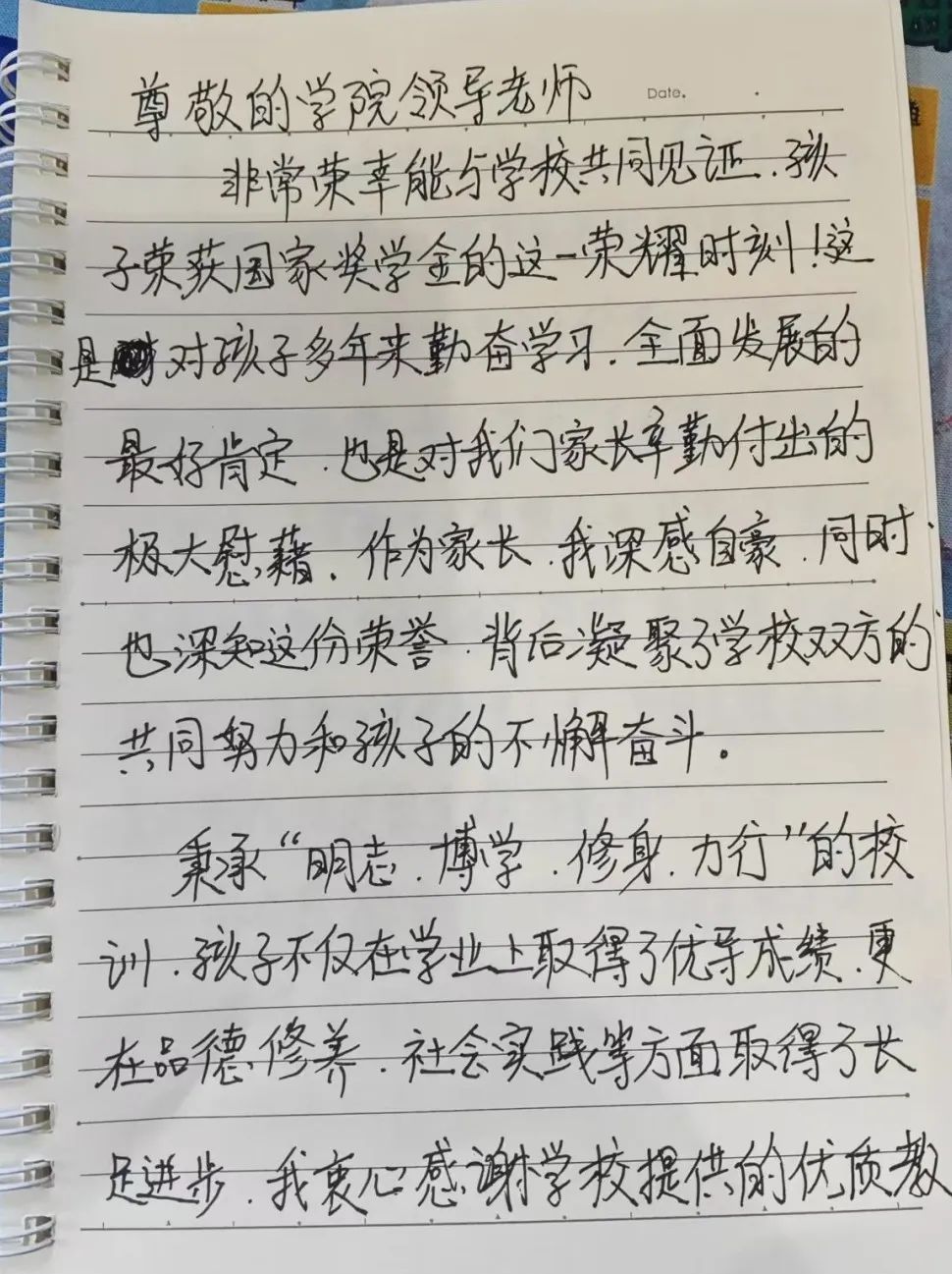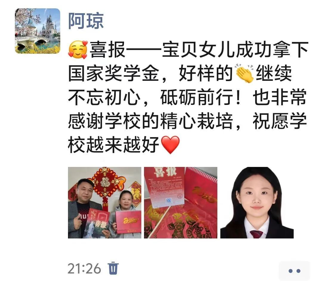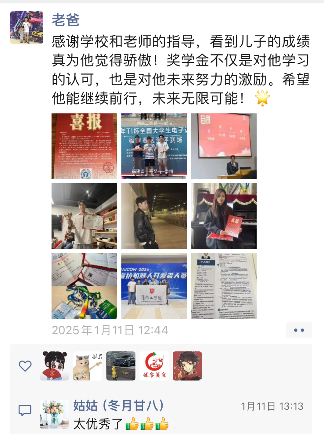 感谢学校和老师的指导,看到儿子的成绩真为他感到骄傲!奖学金不仅是对他学习的认可,也是对他未来的激励。希望他能继续前行,未来无限可能!