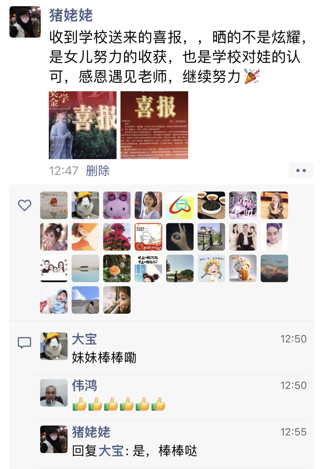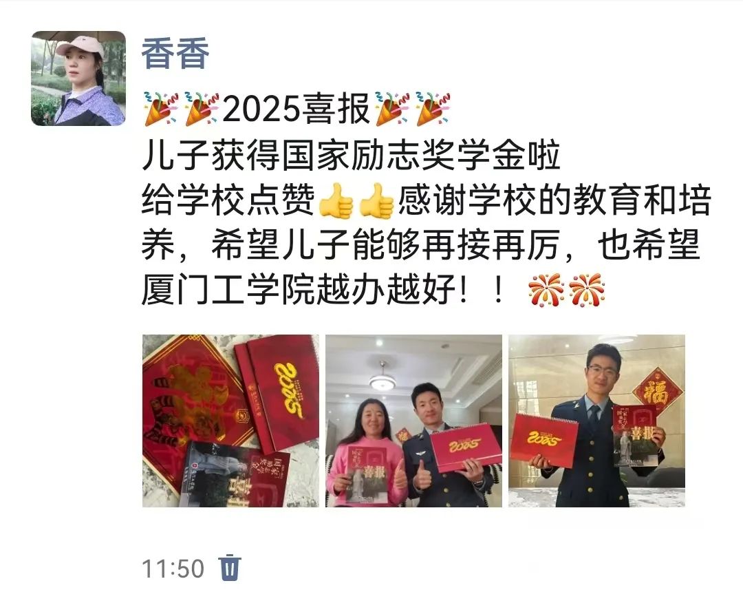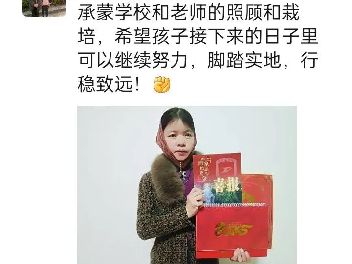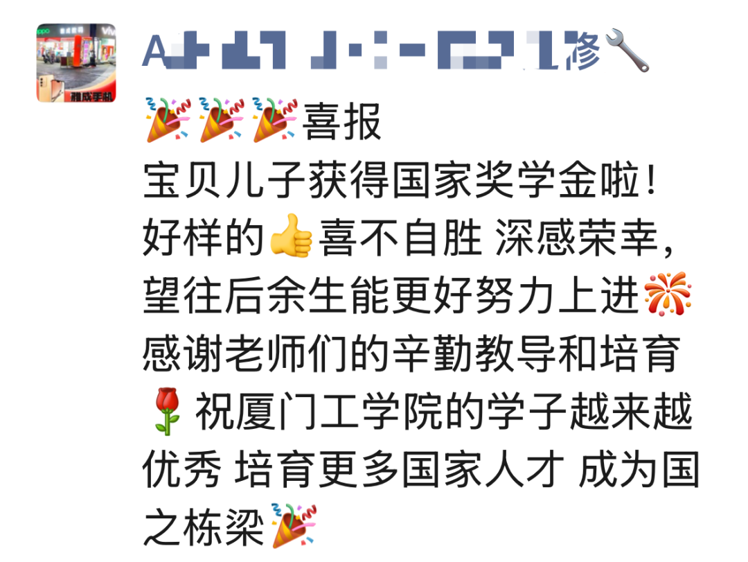 感谢学校和老师的指导,看到儿子的成绩真为他感到骄傲!奖学金不仅是对他学习的认可,也是对他未来的激励。希望他能继续前行,未来无限可能!