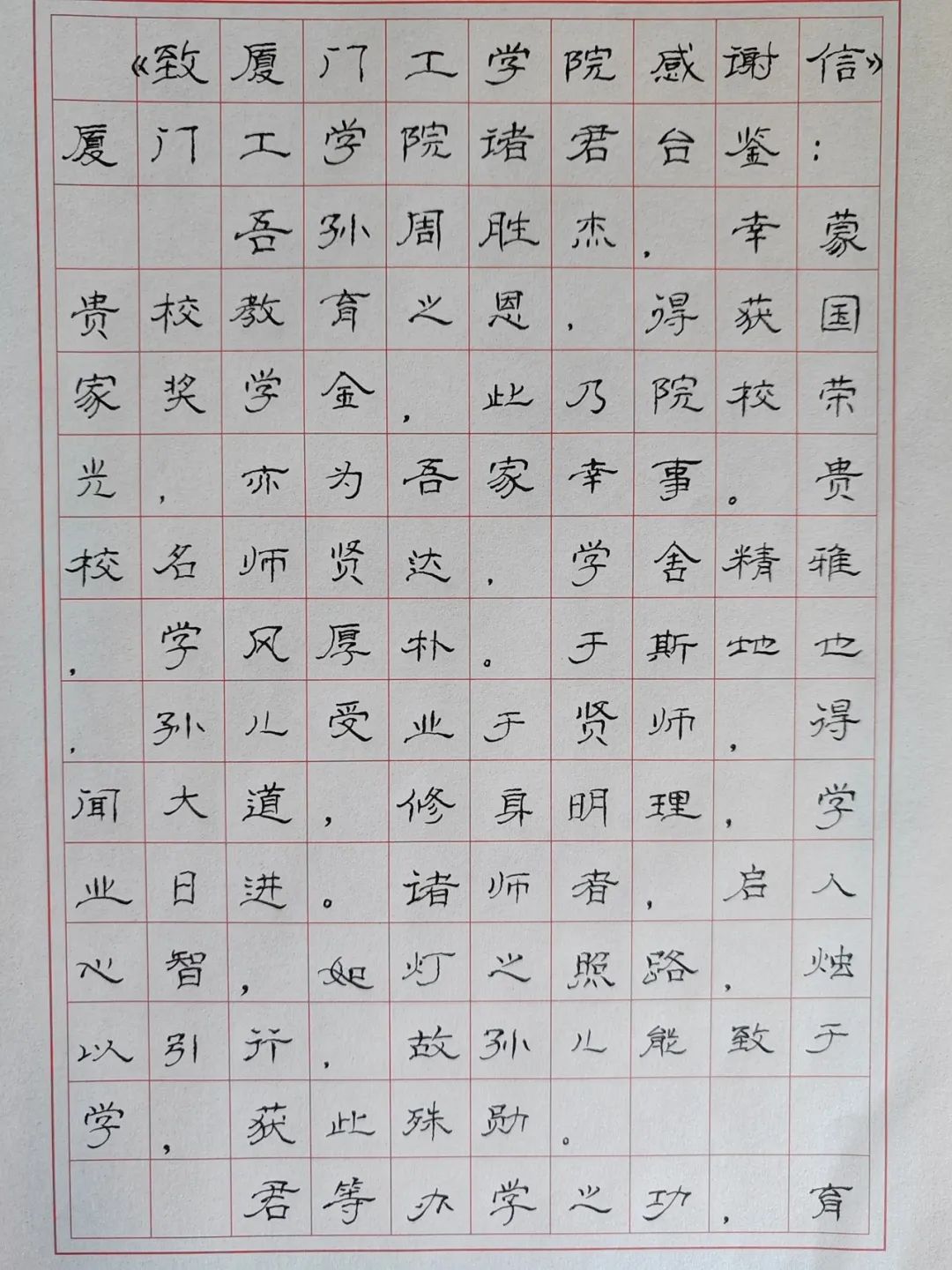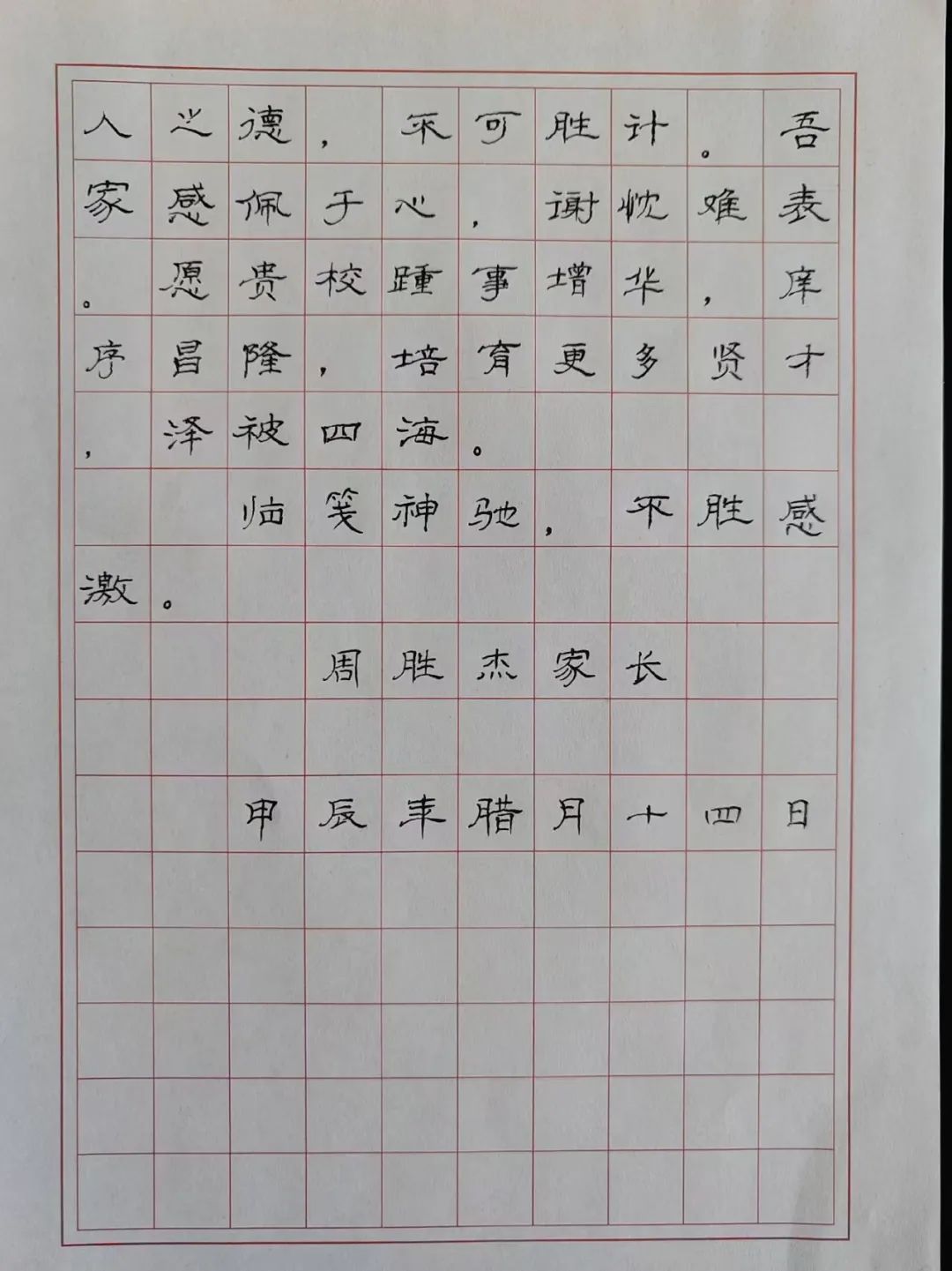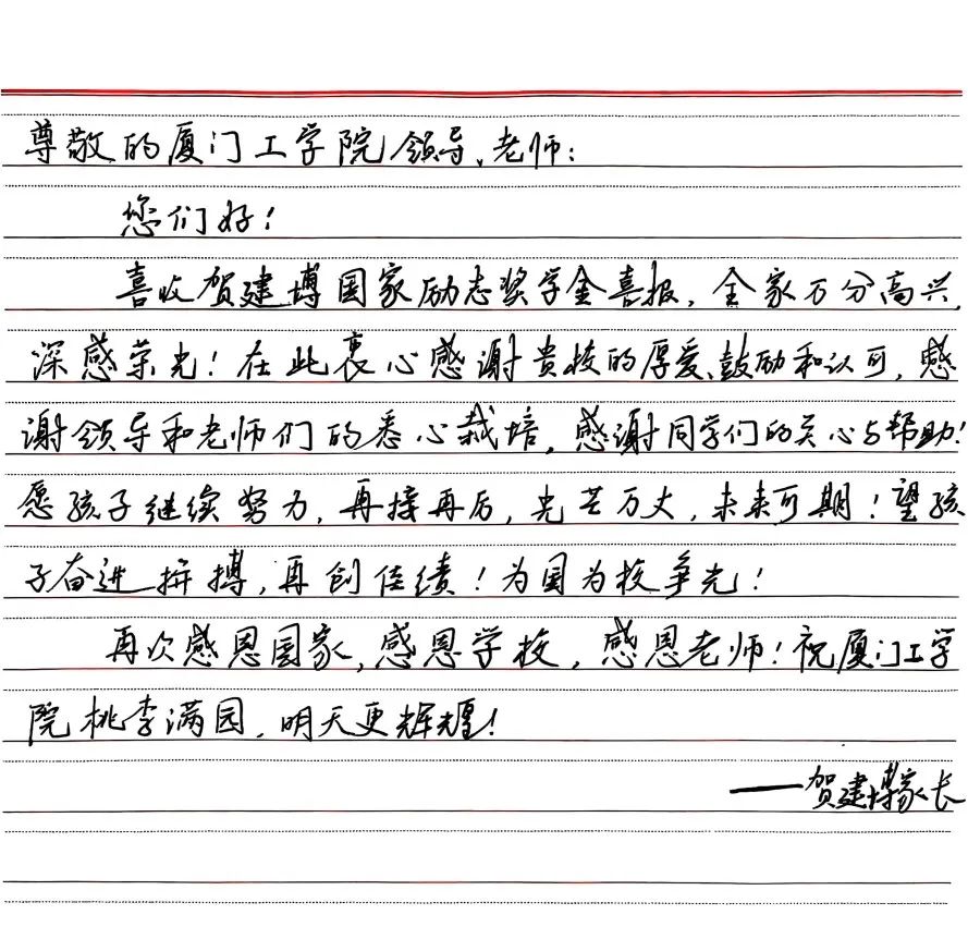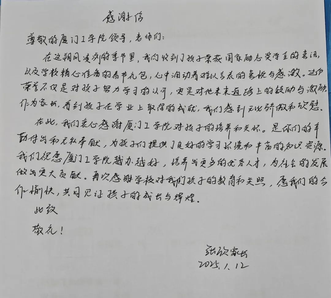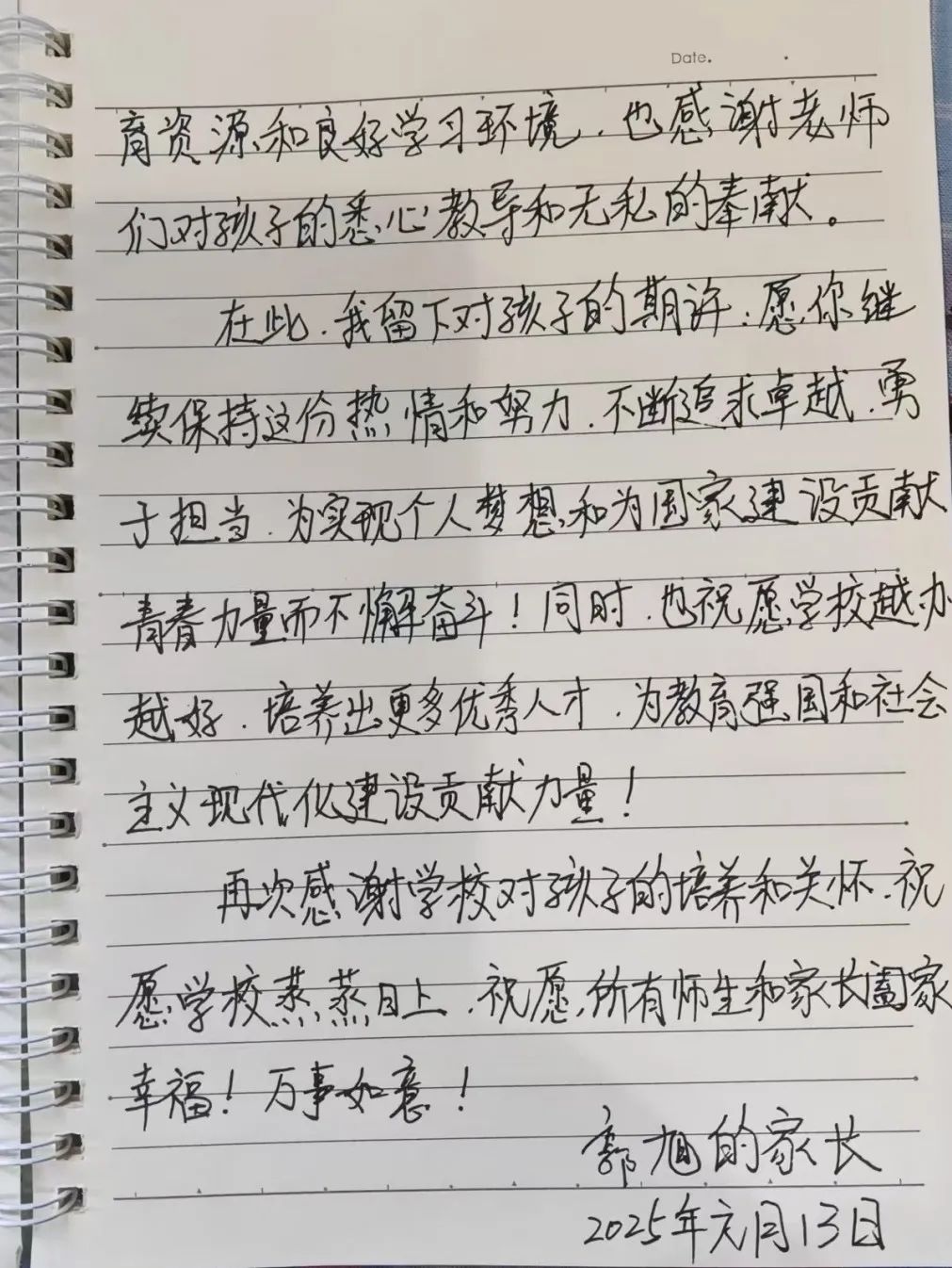 愿你继续保持这份热情和努力,不断追求卓越,勇于担当!同时,也祝愿学校越办越好,培养出更多优秀的人才,为教育强国和社会主义现代化建设贡献力量!再次感谢学校对孩子的培养和关怀,祝愿学校蒸蒸日上!
