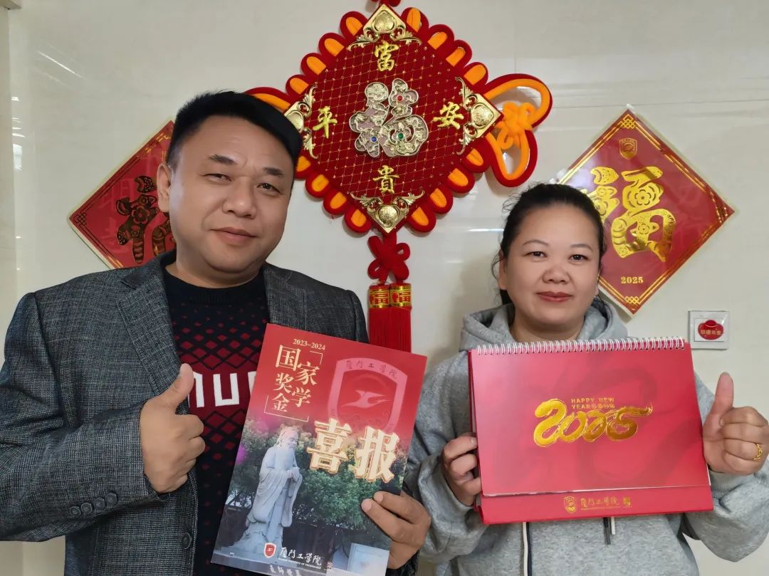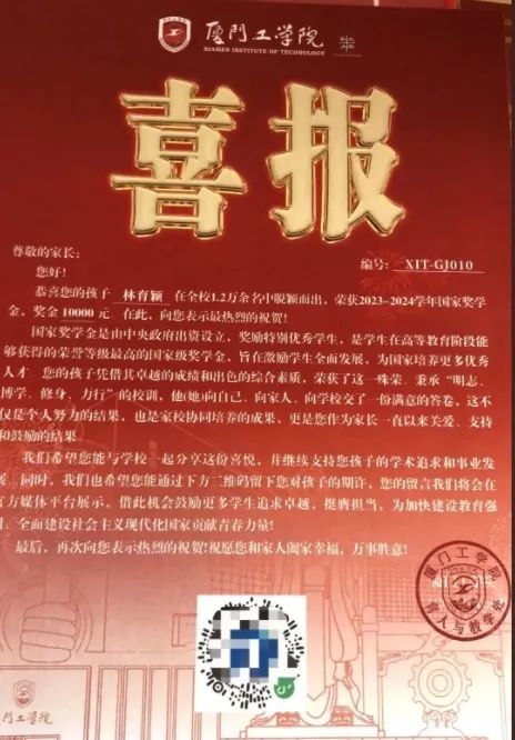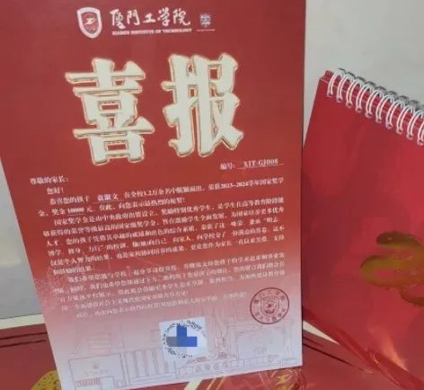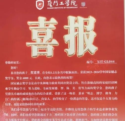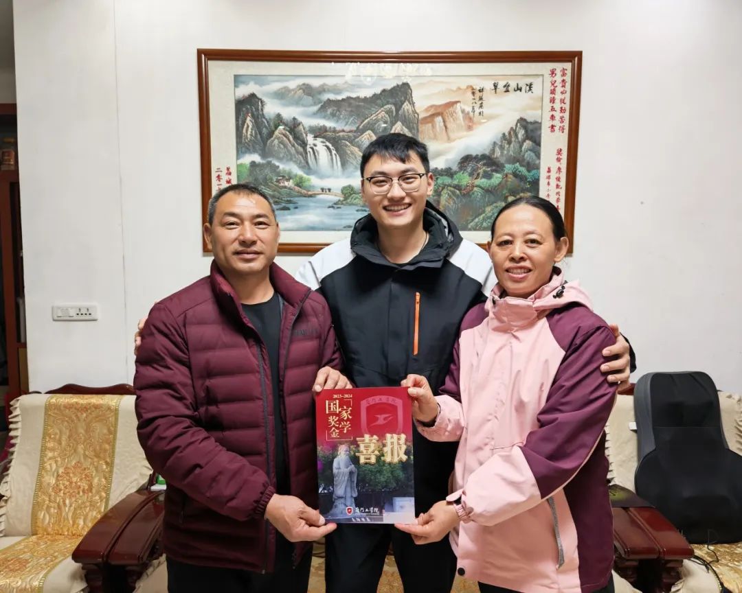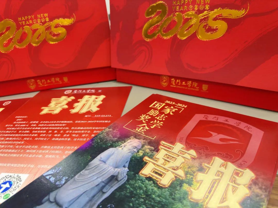 2023-2024学年我校共有24名学生荣获国家奖学金、295名学生荣获国家励志奖学金。近日,学校为所有获得国家奖学金和国家励志奖学金的319个学生家庭寄送喜报和春节祝福礼包。