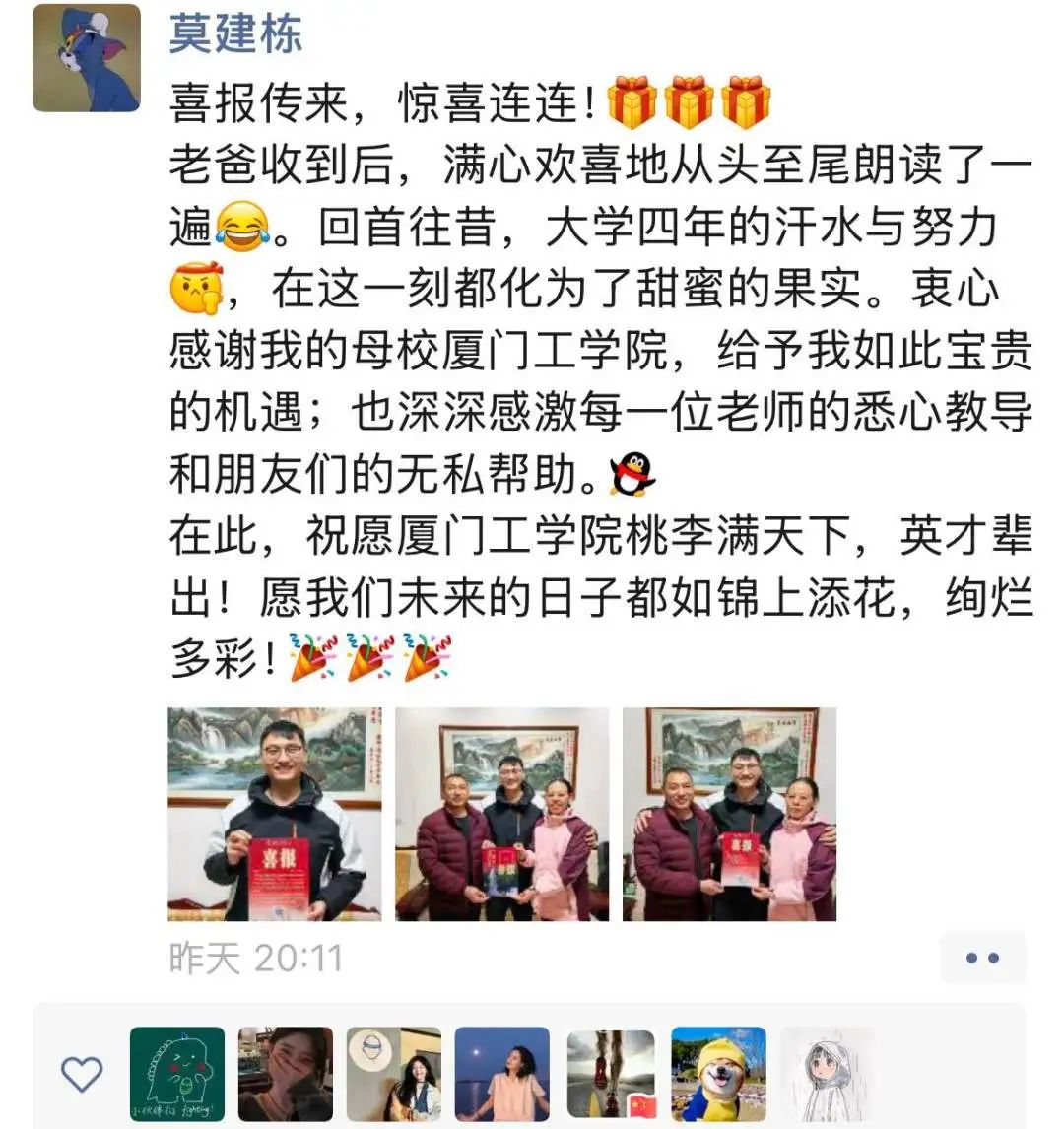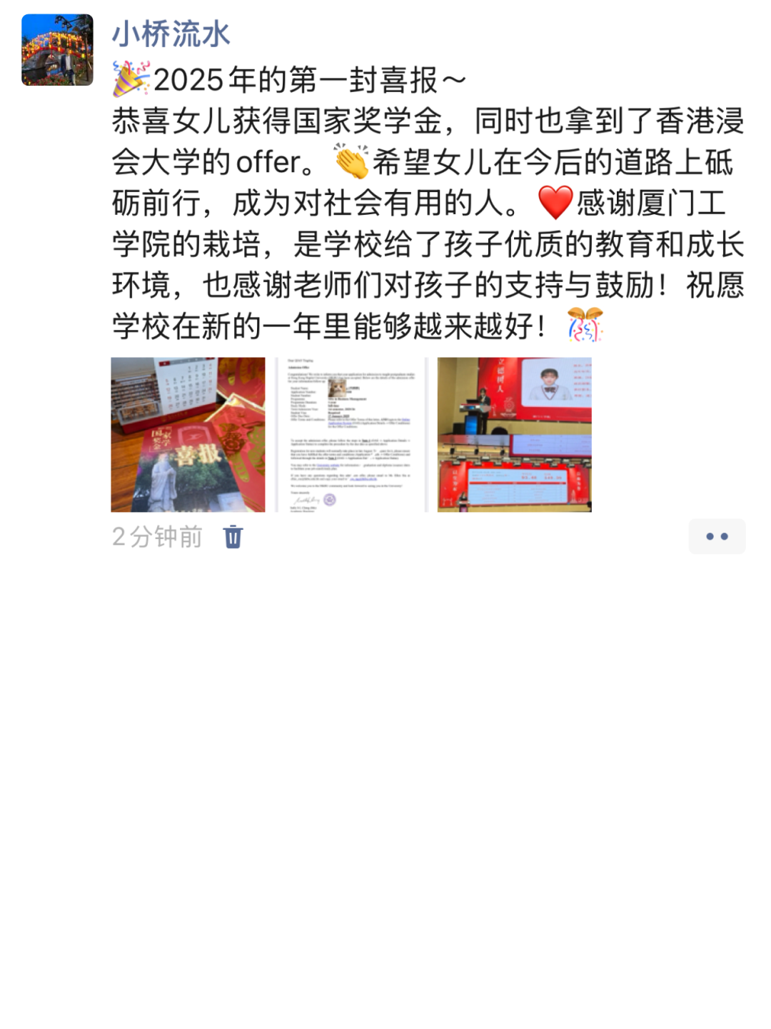 “惊喜”包裹从厦门发出,跨越大江南北,送往广东、甘肃、黑龙江等27省70个地市,最远的喜报寄到了3400多公里外的黑龙江佳木斯市群胜乡。不少家长收到后立刻发了朋友圈,表示“全家人都很惊喜”“学校很暖心,仪式感满满”“感谢学校的栽培”……今天,让我们一起分享学生与家长们的喜悦与荣耀吧。