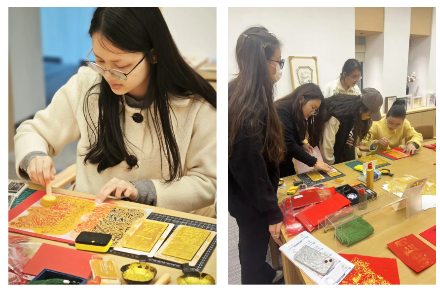 非遗艺术创作坊(以下简称“非遗坊”)展示了丰富的非遗衍生作品,包括创意笔记本、书签等文创产品及学生们的DIY工艺品。学生浏览了蛇年IP设计海报和AI非遗主题海报,体验了拓印传统图案(如蛇年红包、门神)和投壶游戏。学生们近距离感受到非遗艺术的魅力,也通过实践增强了对传统文化的认知和热爱。此外,非遗坊还特别准备了新年心愿卡,增加了活动的趣味性。