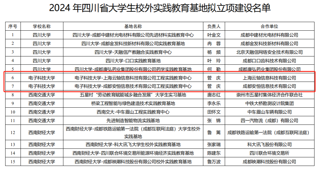 近日,四川省教育厅公示了《2024年四川省级大学生校外实践教育基地拟立项建设名单》,信息与软件工程学院联合成都安恒信息技术有限公司和上海云轴科技股份有限公司申报的两项校外实践教育基地成功获批(全校仅有两个)。这是学院继此前获批3个省级实践教育基地后,在工程教育改革和校企协同育人方面的又一成绩。截至目前,学院累计建成5个四川省级校外实践教育基地、3个国家级校外实践教育基地(长虹电器股份有限公司,中软国际教育科技集团,IBM),并与超过460家知名企业建立稳定的校企合作关系,形成了完善的校企协同育人体系。