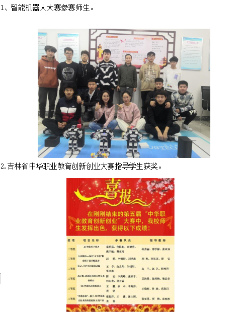 2022年学院师生获各类奖项37个,其中包括2022年全国高职院校信息素养大赛,2人进入国赛决赛,学生个人赛获特等奖3人,一等奖2人,二等奖6人,三等奖2人;全国高职院校信息素养大赛教师微课赛获一等奖1人,三等奖1人;吉林省服务机器人场景应用与开发获一等奖1人,三等奖1人;吉林省机器人技能赛获二等奖2人;2022年吉林省大学生创业计划竞赛获2等奖等。