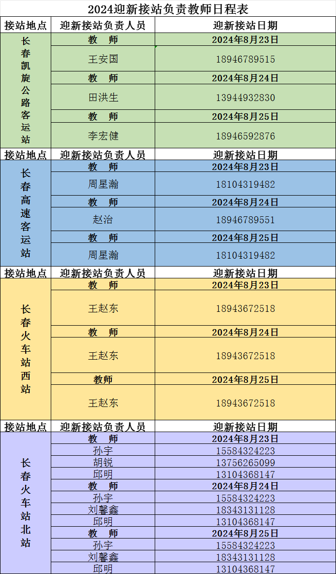 你们将于8月23日至25日分批到校报到,为了保证同学们能够顺利安全的到达学校,学院将在各车站安排新生接站车,请大家知晓。具体接站地点、联系人和注意事项如下: