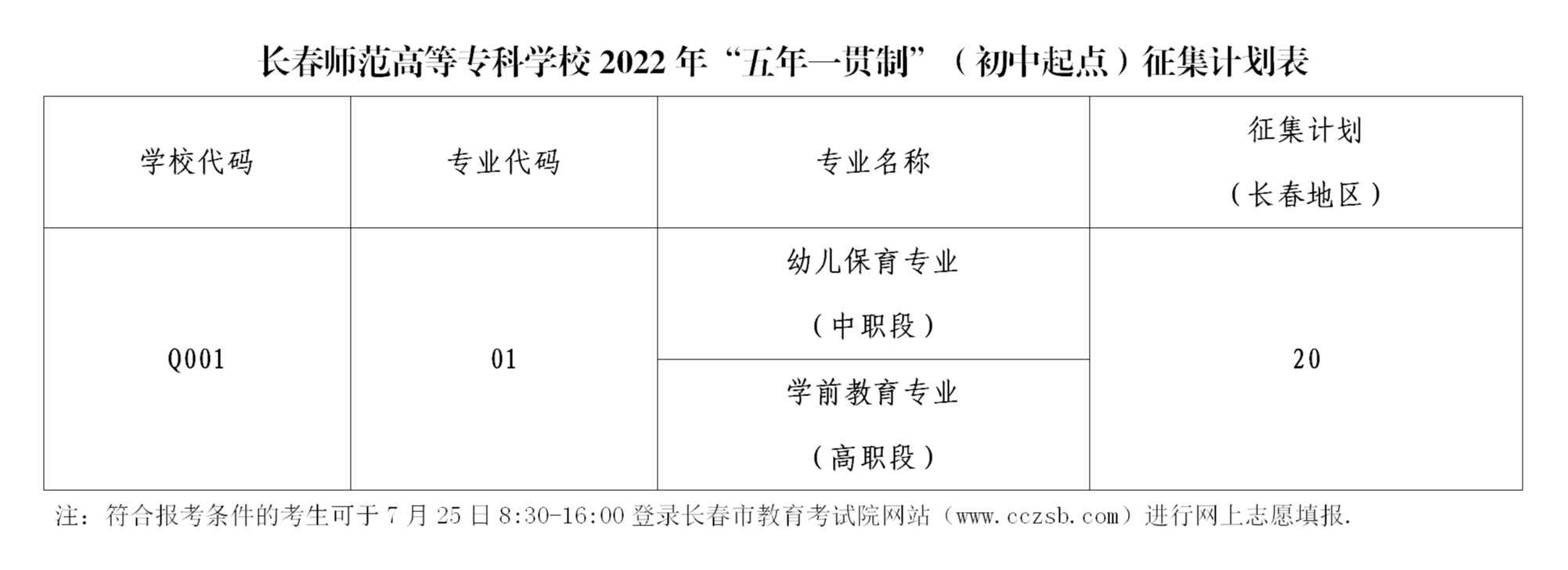 长春师范高等专科学校2022年“五年一贯制”(初中起点)征集计划
