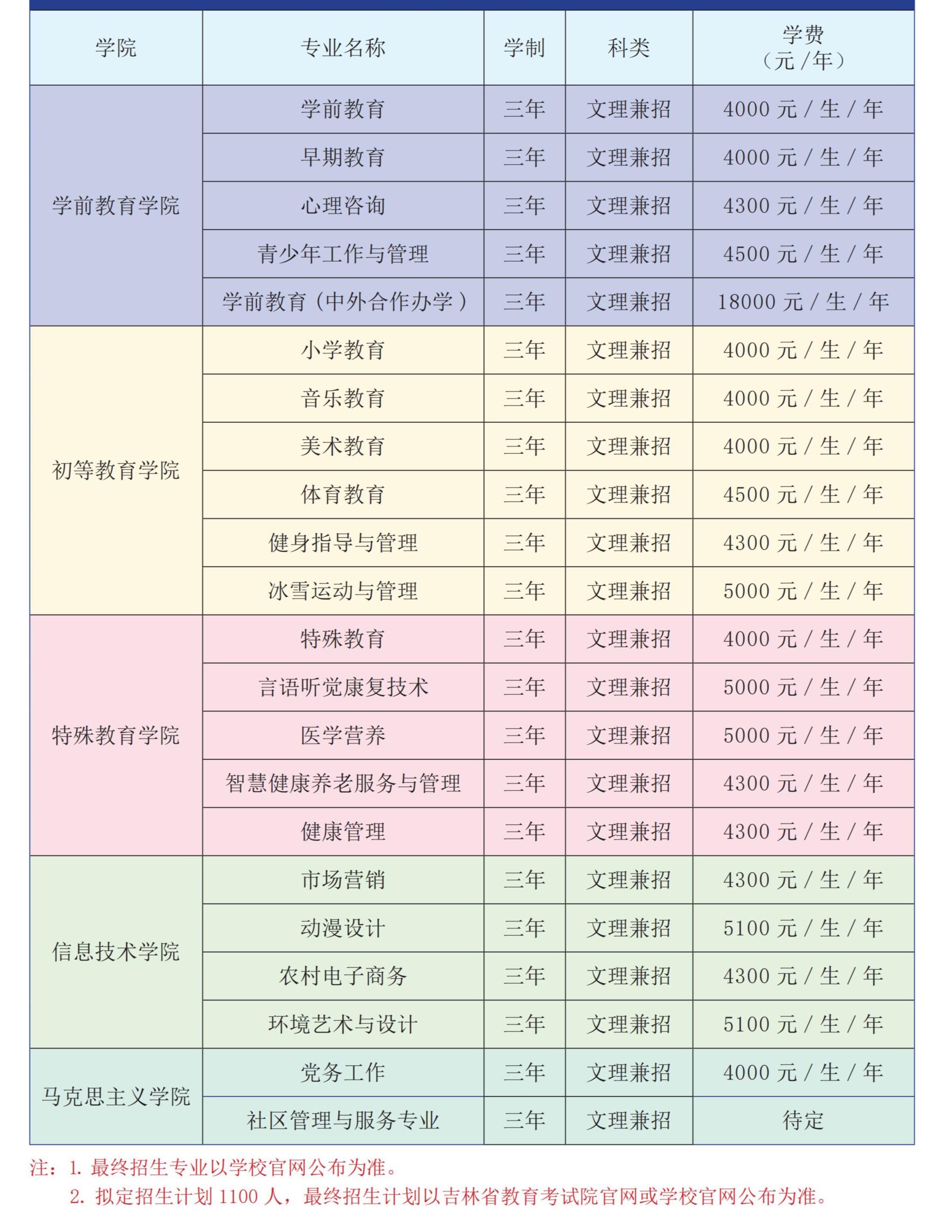 长春师范高等专科学校2023年高职单招招生专业一览表