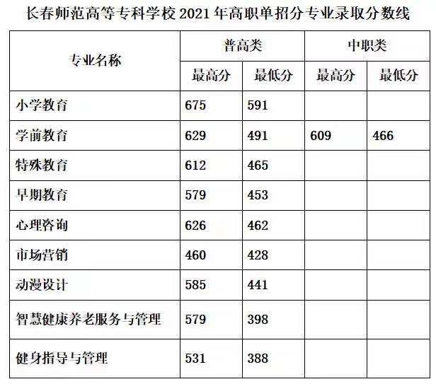 2021年吉林省高职单招分专业录取分数线