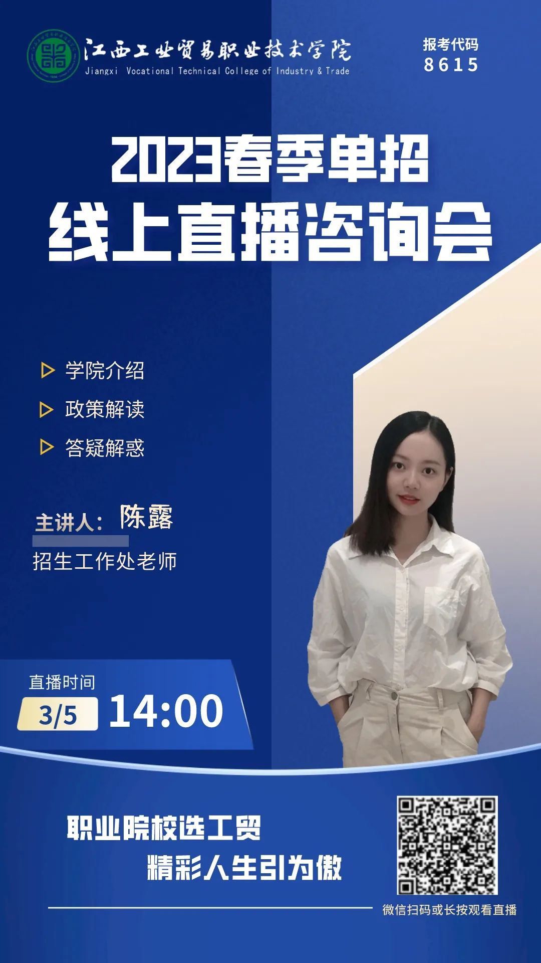 为满足广大考生和家长的高职单招咨询需求,建立更直接有效的信息沟通渠道,更加全面、精准服务考生及家长,学院将于3月5日举办“2023春季单招线上直播咨询会”,与大家相约云端,探秘大美工贸。届时将全方位展示学院办学成就、学科专业特色等内容,对单招政策及考试大纲等方面进行详细解读。敬请关注!