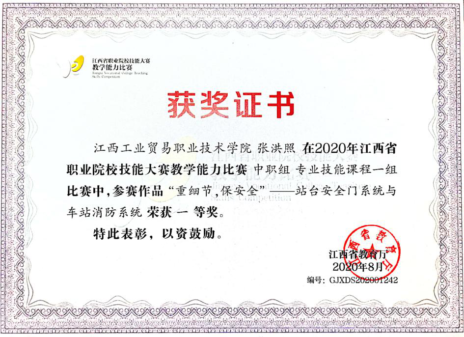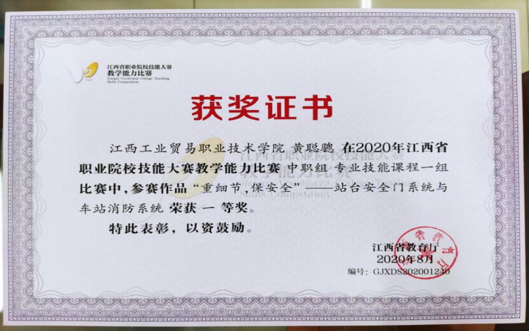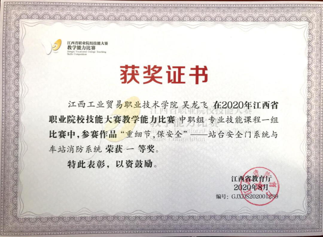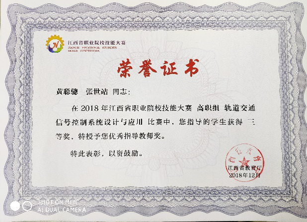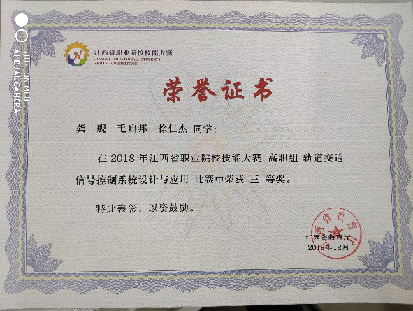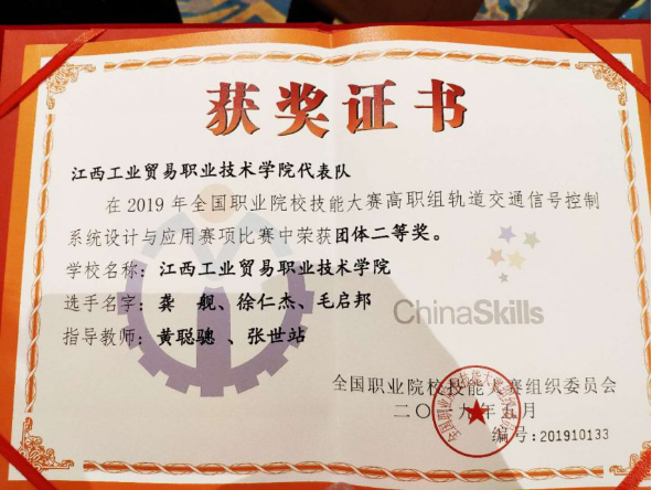 2019年6月首次参加全国职业院校技能大赛“轨道交通信号控制系统设计与应用竞赛”荣获二等奖(排名为江西省参赛院校第一)