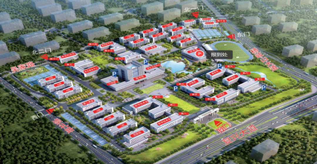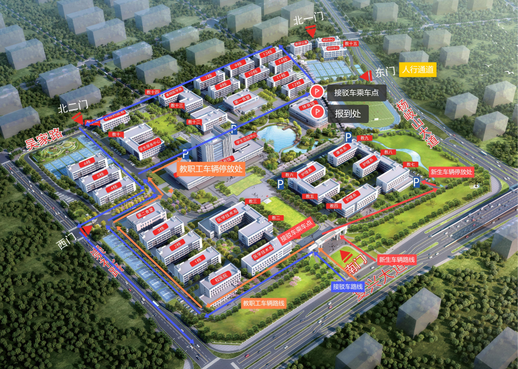 新生报到期间统一从学校正大门(南门)新生车辆通道驶入校园,新生车辆停放至校园内地下停车场(路面不可停车),所有车辆一律从学校西门驶离校园。凭“新生录取通知书”入校。校内车位停满后,新生自驾车辆可在杨岐山大道、复兴大道单侧有序停放。学校在复兴大道设有公交车接驳点,车辆停放在复兴大道的新生及家长可搭乘接驳车进入校园;车俩停放在杨岐山大道的新生及家长可从学校(东门)步行进入校园。